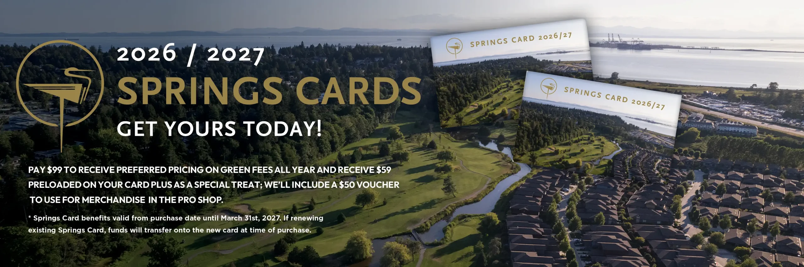 Tsawwassen Springs has exceptional drainage, which keeps our golf course green, dry and playable every day of the year. And with this limited promotion on our 2026/2027 Springs Golf Card, you can save a lot – and enjoy all-season golf for a lot less.